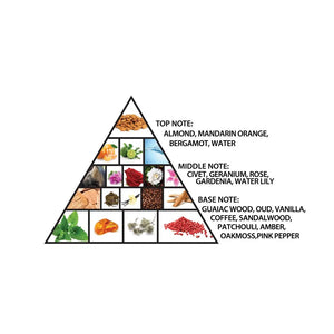 The fragrance opens with a smooth and intriguing blend of almond, orange, bergamot, and watery notes, creating a fresh yet subtly creamy introduction. As it develops, the heart unfolds into an elegant floral bouquet of rose, geranium, gardenia, and water lily, adding softness, sophistication, and balance.