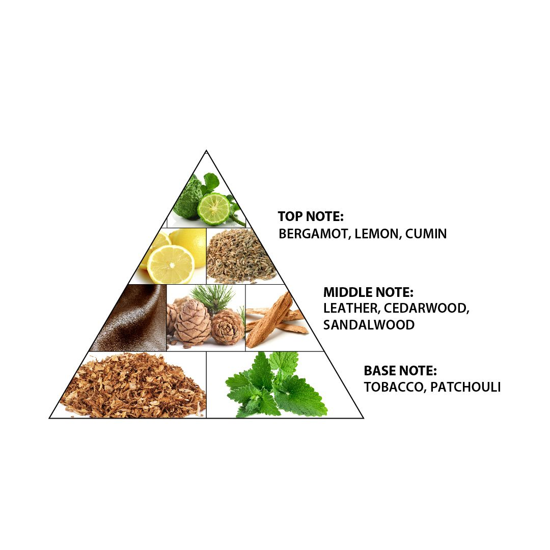 The fragrance opens with the zesty freshness of bergamot and lemon, subtly spiced with cumin to create a sharp yet intriguing introduction. As it develops, the heart reveals a warm, robust blend of leather, cedarwood, and sandalwood, adding structure, depth, and a refined masculine edge.